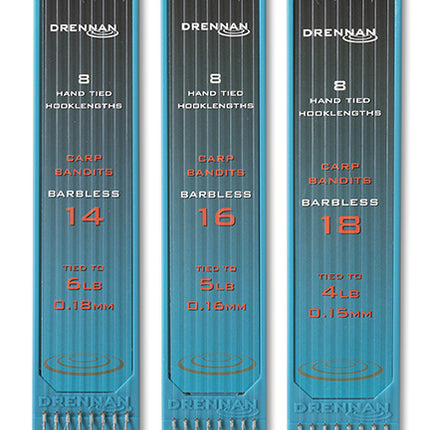 The Barbless Carp Hair Rigger hooks used on these Carp Bandit hook lengths have an acute upturned eye which is designed specifically to allow the hook sit straight on the hook link improving presentation and hooking ability.